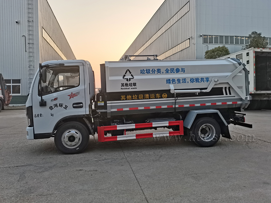 該車箱體有效容積:6.5立方,箱體前部側(cè)面帶有掛桶提升機構(gòu),可自動舉升垃圾桶倒入垃圾,整車帶自卸功能,后門裝有橡膠密封條,防污水滴漏,杜絕二次污染。掛桶垃圾車可根據(jù)客戶要求搭配120升或240升塑料桶和鐵桶。
