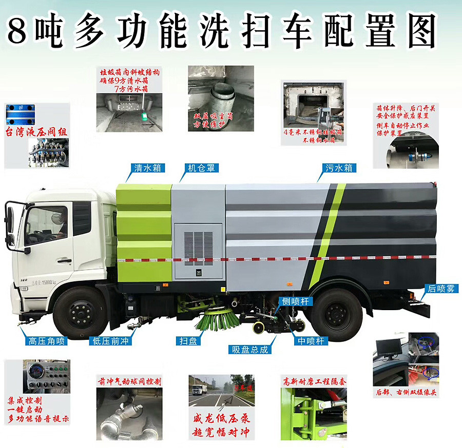 1)該車集掃路車、灑水車和高壓清洗車功能于一體,具備路面清掃、路面洗刷、高壓清洗、低壓沖洗、路緣石洗刷、垃圾收集、污水回收、噴霧降塵和道路隔離墻清洗、小廣告清洗等多種作業(yè)功能。