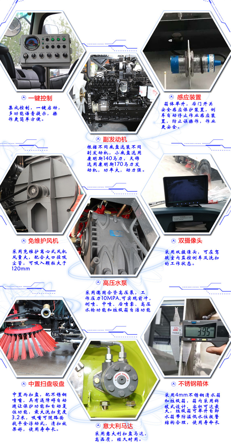 | 標(biāo)準(zhǔn)配置: | 采用“中置二掃盤+中置吸嘴+后噴霧裝置”的結(jié)構(gòu)布局,康機(jī)170馬力的副發(fā)動機(jī),三洋馬達(dá),德國原裝進(jìn)口高壓水泵(帶前沖/側(cè)噴/中噴/后噴霧/側(cè)沖洗車水**/垃圾箱自潔裝置),高壓路沿清洗噴頭,威龍低壓水泵,不銹鋼的水箱垃圾箱(均帶防溢或低水位報(bào)**裝置),施耐德的**開關(guān)、美國傳感器,尾部的LED箭頭燈,倒車及洗掃狀態(tài)室內(nèi)監(jiān)視器。18米高壓沖洗卷盤,集成式運(yùn)動**器,一鍵電腦**。 |