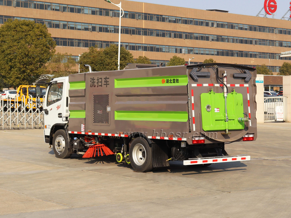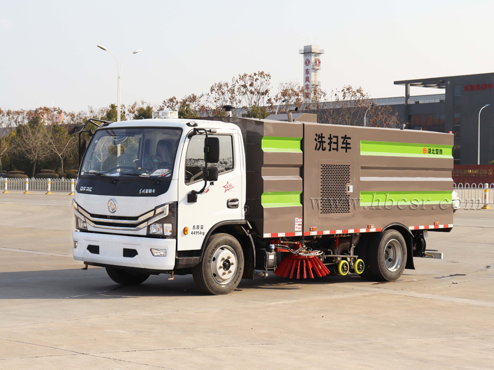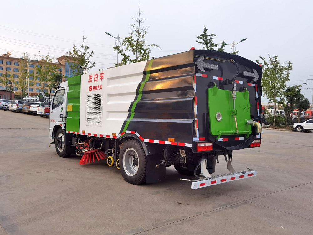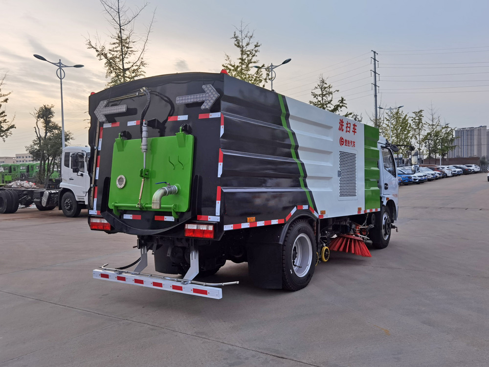 ▲東風多利卡洗掃車利用高壓水流對路面進行強力沖洗,掃刷配合作業(yè),吸盤將污水及垃圾一并回收入箱體