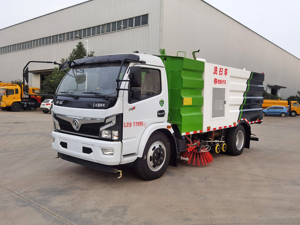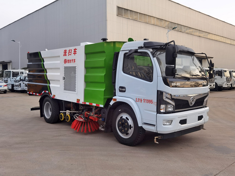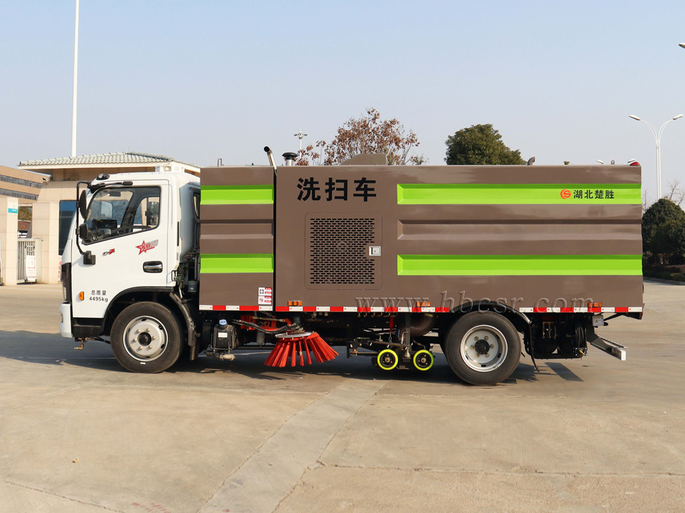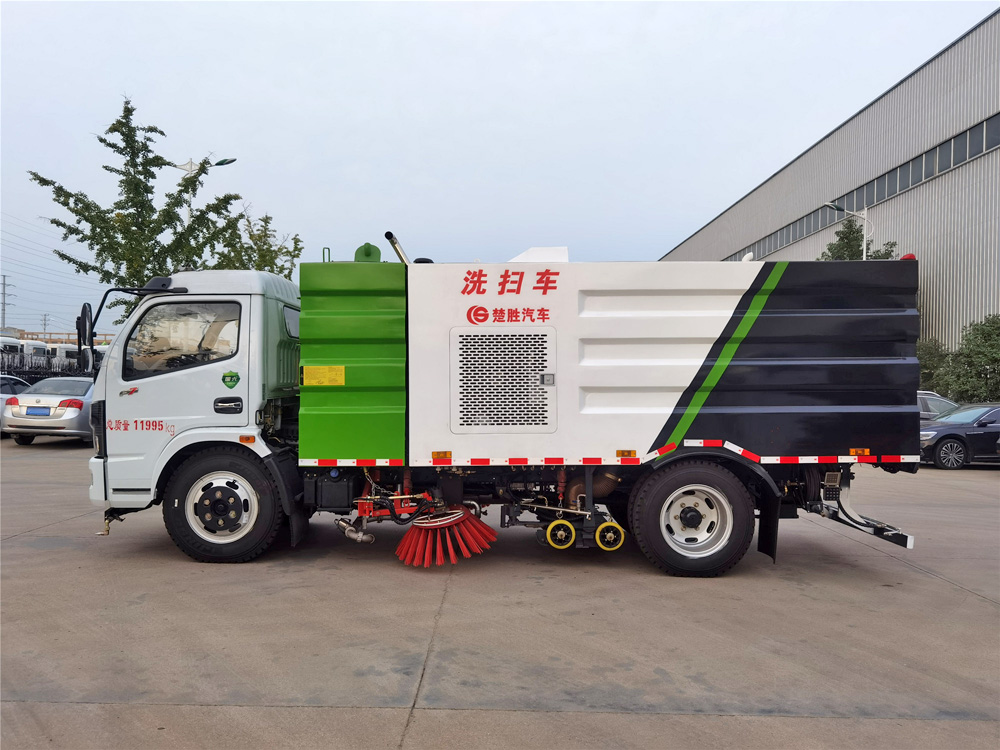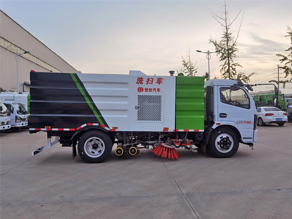 ▲東風多利卡洗掃車利用高壓水流對路面進行強力沖洗,掃刷配合作業(yè),吸盤將污水及垃圾一并回收入箱體