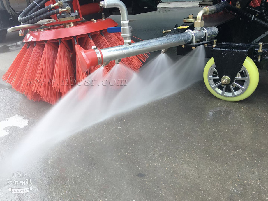 ▲洗掃車前置2個噴霧嘴(高壓水路),調(diào)節(jié)噴灑角度可用清洗路緣石或給路面加濕壓塵