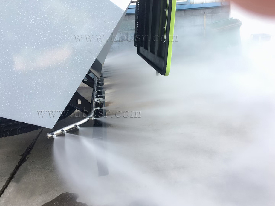 后噴霧:在洗掃車后部垃圾箱下方配有噴霧噴桿,噴霧噴桿上裝有多個噴霧噴嘴。啟動副發(fā)動機和高壓水泵,打開后噴霧開關(guān),啟動底盤車前行,就可進行噴霧降塵作業(yè)。