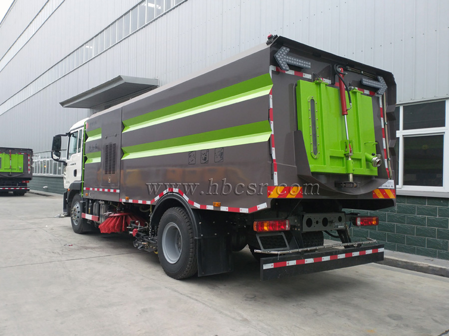 6)具備倒車保護裝置,在作業(yè)過程中如遇緊急倒車,智能化的控制系統(tǒng)會自動停止作業(yè)并收回掃盤、吸盤和側(cè)噴桿;具有防止舉升垃圾箱翻車保護;具有檢修安全保護。